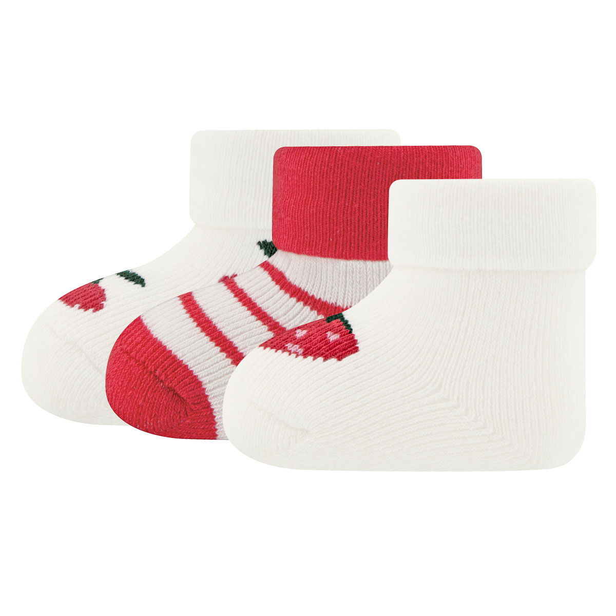 Dieser modische 3er Pack Erstlingssöckchen mit Umschlag mit niedlichem Früchtemotiv und Ringel ist das perfekte Geschenk für Neugeborene und Babys.